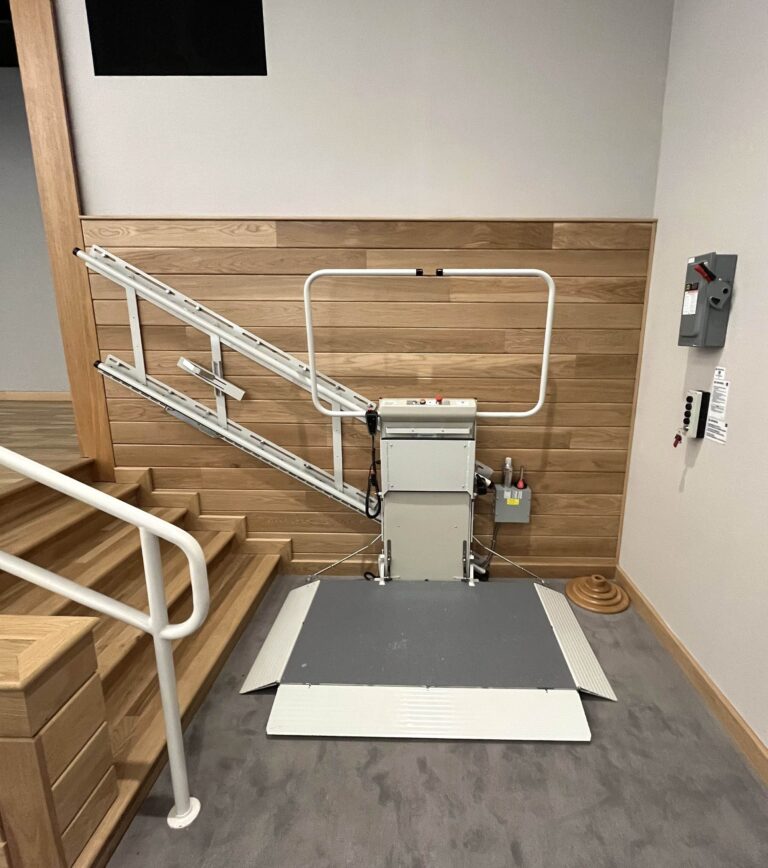 The folding platform, available in ADA-compliant size, allows easy access to stairs when the lift is not being used, making this a popular choice for schools, churches and other public buildings. Optional ADA-compliant platform, ideal for public accessibility requirements.